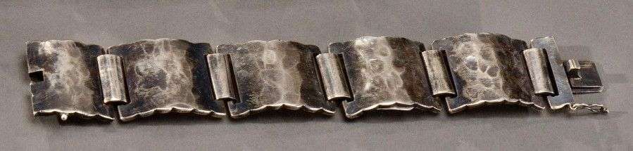 Bracelet en argent martelé composé de cinq mailles quadrangulaires à découpes polylobées. Signé "J.Després" et poinçon de l'artiste. Vers 1950. L: 17 cm Poids brut: 90 g A hammered silver bracelet composed of five quadrangular foiled links. Signed "J.Després" artist's hallmark. Circa 1950. L: 6 ¾ in Weight: 0,20 Ibs
