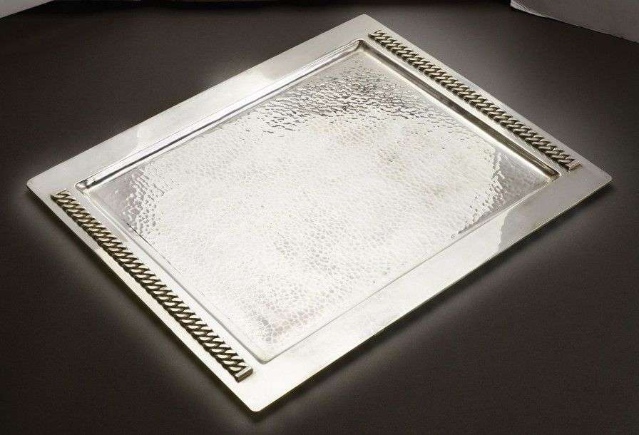 Plateau rectangulaire en métal argenté à fond central martelé. Prises latérales ornées de larges chaines à maillons plats en application. Signé «J. Desprès» et poinçon de l'orfèvre. Vers 1950. L: 54 cm P: 45,5 cm A silver-plated metal tray with side handles adorned with large, flat link chains. Signed «J. Desprès» and silversmith's hallmark. Circa 1950. L: 21 ¼ in D: 18 in