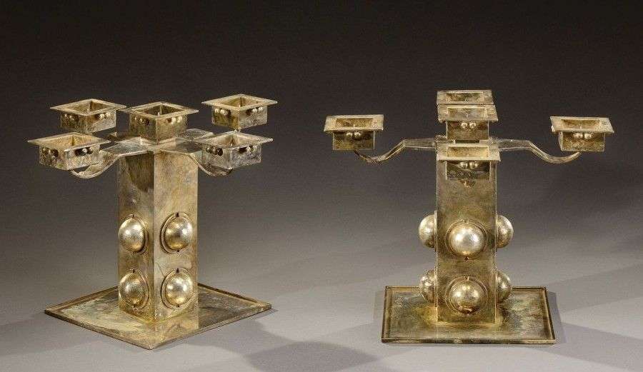 Paire de bougeoirs modernistes en métal argenté à surface unie et martelée. Ils présentent un fût droit cubique agrémenté de cabochons demi-hémisphériques, surmonté de cinq bras de lumière terminés par des coupelles carrées soulignées de sphères adossées. Ils reposent sur une base carrée. Signés "J.Després" et poinçons de l'orfèvre. Vers 1930. H: 26 cm A pair of modernistic, silver-plated candle holders with five branches of lights ending in small square bowls. Signed "J.Després" and silversmith's hallmark. Circa 1930. H: 10 ¼ in Bibliographie: Melissa Gabardi, "Jean Després Bijoutier et orfèvre entre Art déco et modernité", Norma Edition, Paris, 2009, pour un modèle de construction similaire reproduit page 171.