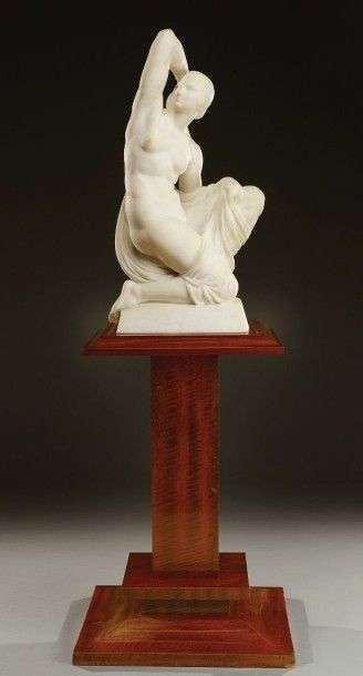 "L'Aurore" Importante sculpture en taille directe sur marbre de Carrare figurant une femme nue assise au drap. Elle repose sur une gaine à fût quadrangulaire et base à doucine en placage d'acajou et d'acajou flammé. Signée "JD.Cormier" et "F.Barbedienne editeur" Vers 1925 H: 70 cm L: 45 cm P: 34 cm (sculpture) H: 145 cm (avec base) A large sculpture, directly carved on Carrare marble representing a draped nude woman seated. It stands on a base in mahogany veneer and mahogany flambé. Signed "JD.Cormier" and "F.Barbedienne editeur" Circa 1925 H: 27 ½ in L: 17 ¾ in D: 13 ½ in (sculpture) H: 57 in (with base) Bibliographie: Art et industrie, numéro 6, Aout-septembre 1926, pour un modèle similaire reproduit à la page 44.
