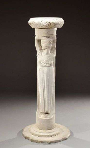 Rare gaine composée de quatre éléments en taille directe sculptée sur marbre blanc figurant une femme à l'antique. Signée R.Largès". Vers 1940. H: 120 cm Diam: 50 cm (légers éclats en bordure) A rare plinth composed of four, directly carved white marble elements representing a woman in ancient style. Signed R.Largès". Circa 1940. H: 47 ¼ in Diam: 19 ¾ in
