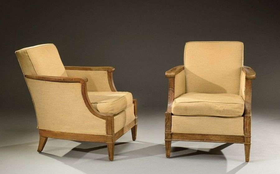 Paire de fauteuils en chêne cérusé à dossier droit et accotoirs pleins à manchettes plates partiellement évidées se terminant par des enroulements, reposant sur deux pieds sabre à l'arrière et deux pieds gainés à l'avant. Garniture de l'assise et du dossier recouverte d'un tissu beige. Vers 1940. H: 75 cm l: 64 cm P: 75 cm (usures et fragilisé) A pair of white leaded oak armchairs covered in beige fabric. Circa 1940. H: 729 ½ in W: 25 ¼ in D: 29 ½ in
