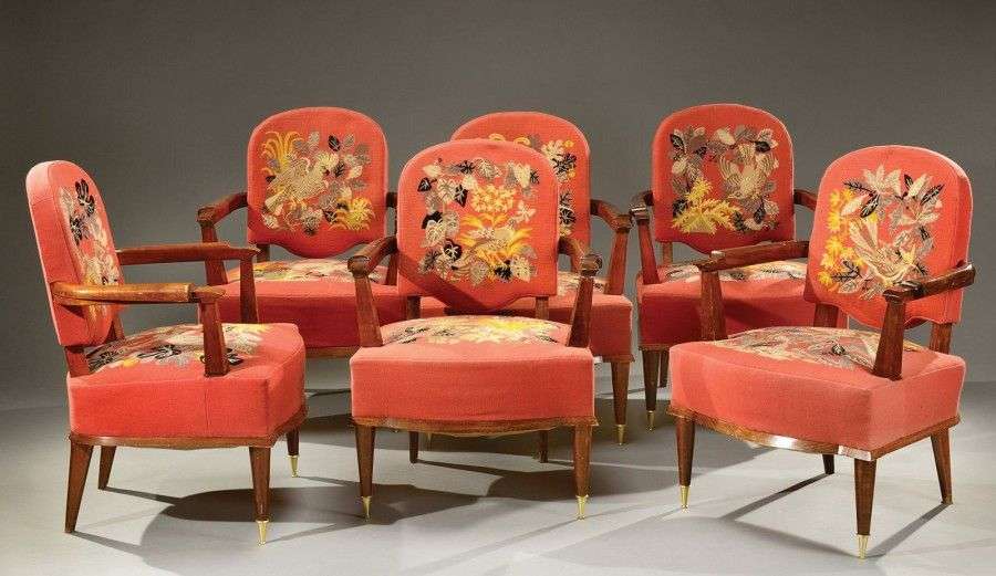 Suite de six fauteuils en acajou à dossier concave et accotoirs à manchettes arrondies reposant sur deux pieds sabre à l'arrière et deux pieds coniques à l'avant terminés par des sabots en métal doré. Ils sont recouverts de tapisseries d'Aubusson portant le monogramme "VM". H: 88 cm l: 63 cm P: 63 cm (légers accidents et manques) A set of six mahogany armchairs covered in Aubusson tapestries carrying the monogram "VM". H: 34 ¾ W: 24 ¾ in D: 24 ¾ in