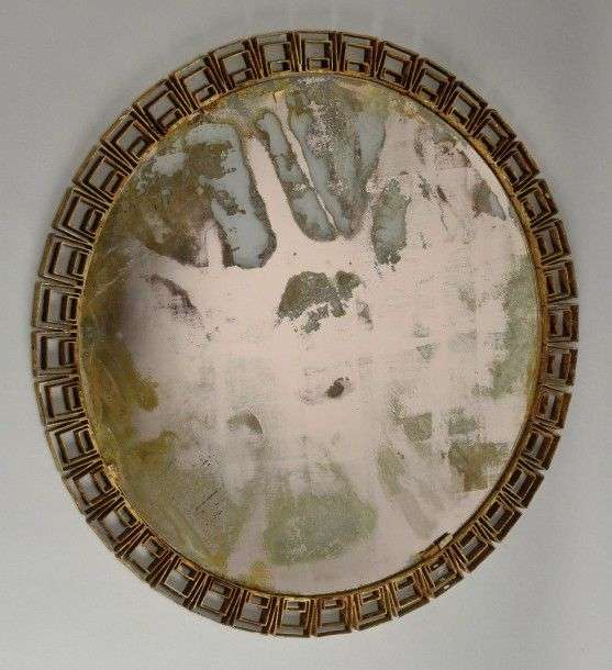Miroir circulaire en métal à décor ajouré d'une frise composée de motifs géométriques superposés. Diam: 81 cm A circular, metal mirror bordered with superimposed geometrical motifs. Diam: 32 in