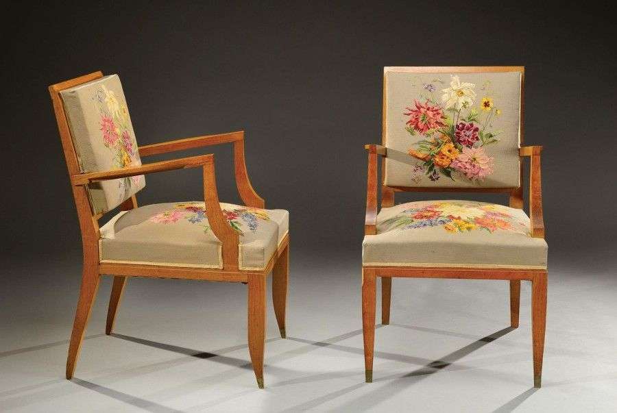 Paire de fauteuils en chêne à dossier droit et assise carrée présentant des accotoirs détachés à manchettes plates galbées reposant sur quatre pieds galbés terminés à l'avant par des sabots en laiton doré. Garniture de l'assise et du dossier recouverte d'une tapisserie polychrome d'Aubusson au point noué à motif de bouquets de fleurs. Vers 1935. Il s'agit d'une commande spéciale sur le modèle de celui réalisé pour la salle du conseil du nouvel hôtel de ville d'Aubusson en 1937. H: 85 cm l: 54 cm P: 57 cm (légers manques) A pair of oak armchairs covered in a polychrome Aubusson tapestry representing a bunch of flowers. Circa 1935. This tapestry was a special order and the same model as the one made for the council room in the new town hall of Aubusson in 1937. H: 33 ½ in W: 21 ¼ in D: 22 ½ in