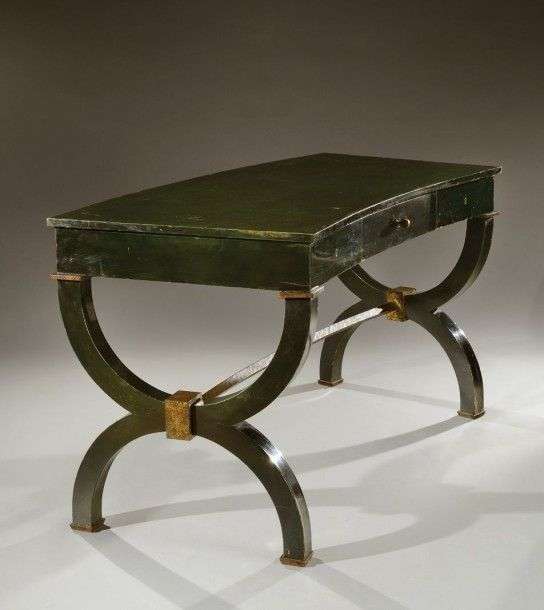 Bureau courbe en bois laqué vert présentant un plateau rectangulaire à bords arrondis ouvrant en ceinture par trois tiroirs et reposant sur un piétement composé de deux éléments formant U inversé reliés par une entretoise. Les finitions sont en fer forgé doré. Vers 1940. H: 77 cm L: 120 cm P: 64.5 cm (usures et légers manques) A curved, lacquered wood desk opening by three drawers with two inverted U shaped elements forming the base. Circa 1940. H: 30 ¼ in L: 47 ¼ in D: 25 ½ in