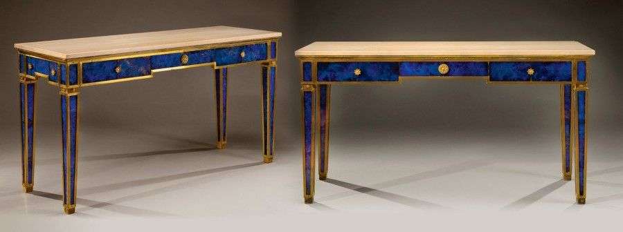 Paire de consoles à plateaux rectangulaires en marbre beige reposant sur quatre pieds gainés reliés par des traverses à découpe géométrique. L'ensemble est recouvert de plaques taillées en verre teinté d'oxydes bleus, encadré de larges filets en bronze doré et agrémenté de motifs étoilés en bois doré. Vers 1940. H: 78,5 cm L: 145,5 P: 45,5 cm (légers accidents et légers manques) A pair of consoles with beige marble tops and covered with tinted blue oxide glass framed with gilded bronze and embellished with starry motifs. Circa 1940. H: 31 in L: 57 ¼ in D: 18 in