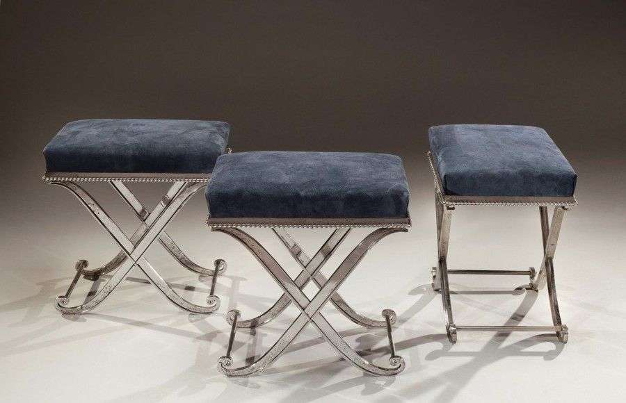 Rare suite de trois tabourets à assise rectangulaire entièrement recouverte d'un revêtement en daim bleu nuit, reposant sur un piétement composé d'épaisses lames d'acier forgé chromé formant «X» soulignés d'une cordelette et terminés par des enroulements. Vers 1940. H: 44 cm l: 44 cm P: 30 cm A rare set of three stools with dark blue suede seats and a base composed of thick strips of chromium-plated forged steel forming an "X". Circa 1940. H: 17 ¼ in W: 17 ¼ in D: 11 ¾ in