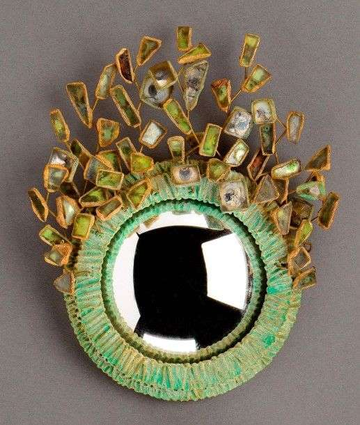 Petit miroir sorcière modèle "Hérissoné" à encadrement de forme circulaire en talosel teinté vert présentant un fronton orné de fils métalliques terminés par des petits carrés irréguliers en talosel incrusté de plaquettes de miroir teinté vert et argenté. Signé du macaron "Roi". Vers 1950. H: 14 cm Diam: 9 cm "Hérissoné", a witch's mirror framed in green talosel adorned with metallic threads ending in small squares of talosel inlaid with small plates of mirror. Signed "Roi". Circa 1950. H: 5 ½ in Diam: 3 ½ in