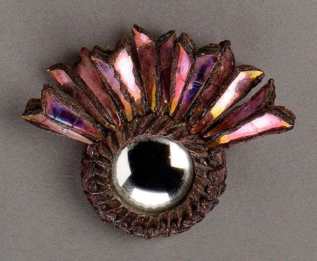 Broche circulaire à encadrement en talosel à décor d'éléments géométriques en verre teinté mauve enserrant un minuscule miroir sorcière. Signé au médaillon "Joux" Vers 1950. H: 5 cm L: 6.5 cm A circular broach framed in talosel with tinted glass geometrical elements holding a tiny witch's mirror. Signed "Joux" Cira 1950. H: 2 in L: 2 ½ in
