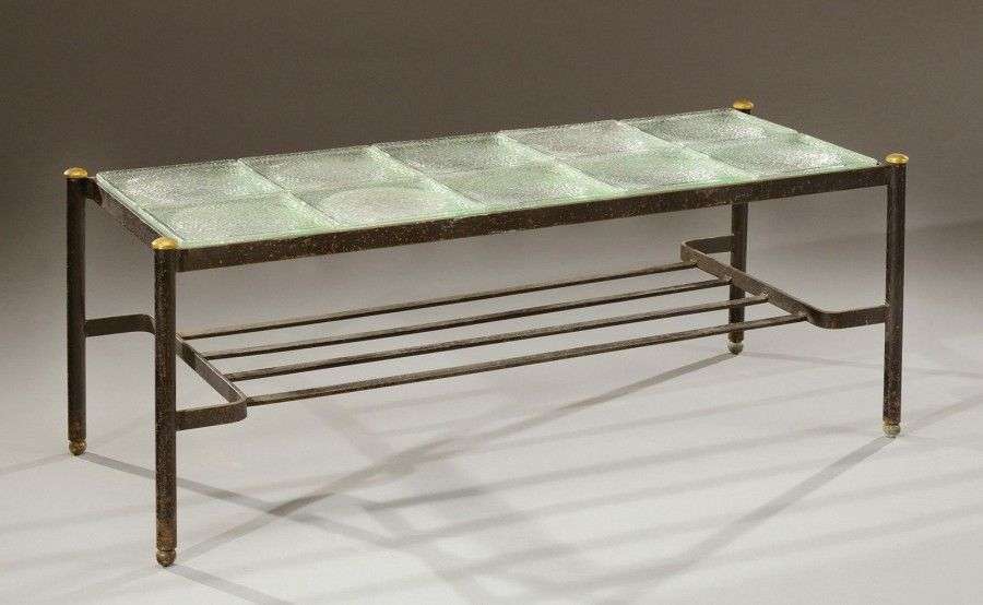 Table basse à piétement tubulaire en métal laqué noir enserrant un plateau supérieur rectangulaire composé de dix dalles de verre carrées évidées de la maison Saint Gobain. Vers 1950. H: 40 cm L: 107 cm P: 44 cm (usures et éclats) A coffee table on a tubular black lacquered metal base holding a top composed of plates of Saint-Gobain glass. Circa 1950. H: 15 ¾ in L: 42 ¼ in D: 17 ¼ in
