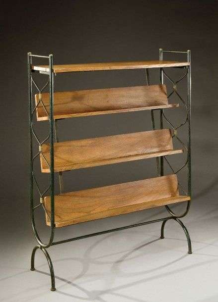 Etagère formant bibliothèque à armature en métal tubulaire courbé et laqué vert, à attaches en laiton doré, présentant quatre plateaux en chêne superposés dont trois légèrement inclinés. Vers 1950. H: 141.5 cm L: 103.5 cm P: 35.5cm (taches et rayures d'usage) A green lacquered tubular metal bookcase with four superimposed shelves in oak. Circa 1950. H: 53 ¾ in L: 40 ¾ in D: 14 in