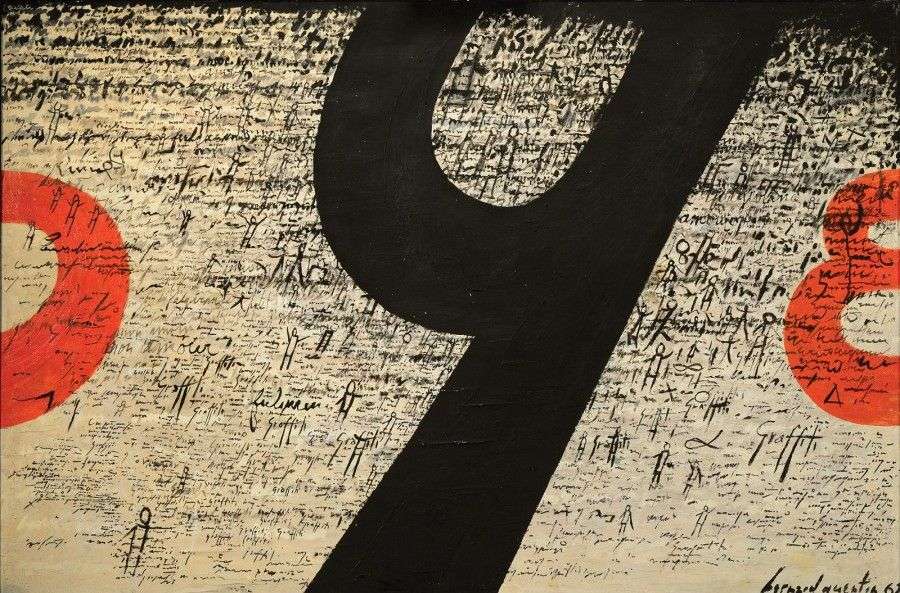 "Composition lettriste" Technique mixte sur bois figurant des chiffres sur un fond composé d'écritures et de personnages. Signé et daté en bas à droite "Bernard Quentin 62". Cette composition de Bernard Quentin peut être considérée comme majeure dans son oeuvre. Elle correspond à sa période italienne lorsqu'il était installé à Milan et qu'il côtoyait des artistes tels que Yves Klein, Spoerri ou encore Arman. La présence de graffiti dans celle-ci est représentative des travaux de Quentin qui utilisent le langage au service de la création plastique. Cette oeuvre datée de 1962 arrive avant l'invention de son «Babel-Web» langage qu'il a lui même inventé s'inspirant des pictogrammes et des hiéroglyphes. 121,5 x 182 cm (léger décollement) A mixed technique on wood representing figures, on a background of writings and characters. Signed and dated on the lower right "Bernard Quentin 62". This composition by Bernard Quentin can be considered as being one of his major works, corresponding to the period when he was installed in Milan and contacting such artists as Yves Klein, Spoerri and Arman. The graffiti in this piece represents Ouentin's use of the language to serve his art. This work dates from 1962, before he invented his «Babel-Web» language inspired from pictograms and hieroglyphics. 47 ¾ x 71 ¾ in