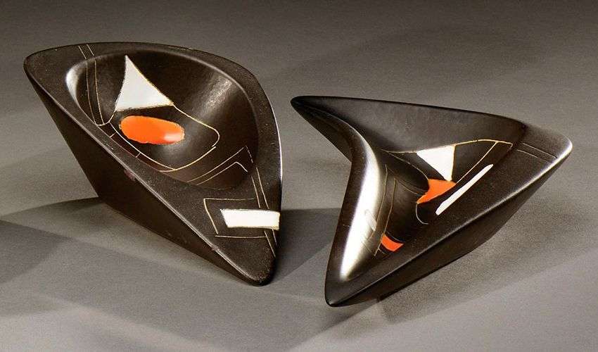 Suite de deux vide-poches de forme libre en céramique émaillée noire à décors de motifs géometriques blancs et oranges. Signés "Orlando". Vers 1950-1960. L: 25 cm H: 5 cm (éclats) A set of two free style black enamelled ceramic pin trays with white and orange geometrical motifs. Signed "Orlando". Circa 1950-1960. L: 9 ¾ in H: 2 in