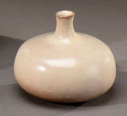 Vase à panse aplatie et petit col droit en céramique émaillée grise. Signé "Ruelland". Vers 1950. H: 7,5 cm (restauration au col) A grey enamelled ceramic vase with a flattened middle. Signed "Ruelland". Circa 1950. H: 3 in