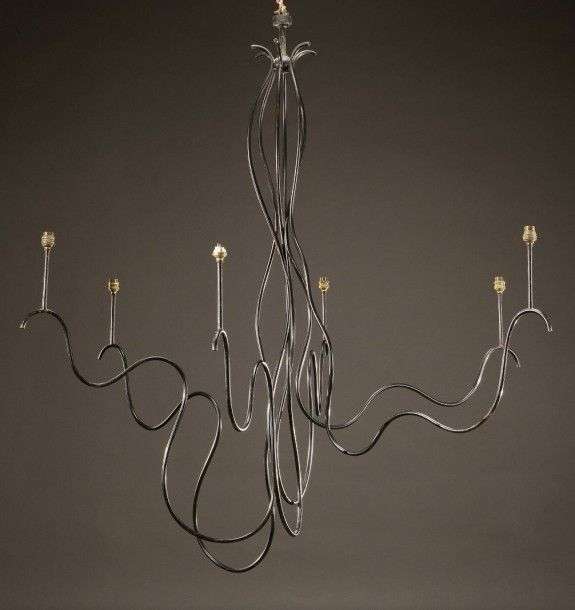Rare et important lustre liane présentant six bras de lumière en métal tubulaire courbé laqué noir. Vers 1950. L'authenticité de ce lustre n'étant pas confirmé à ce jour, il est vendu sous la dénomination "attribué à". Néanmoins, nous confirmons l'ancienneté de la fabrication. Une paire d'appliques «Liane» à été vendue chez Pierre Bergé à Bruxelles le 16 décembre 2010 pour la somme totale de 62.000. Celles-ci avaient la même provenance que cet exceptionnel lustre. H: 146 cm Diam: 142 cm (abat-jour manquants sauf un qui sera remis à l'acquéreur) A large and rare liana centre light with six bent tubular metal branches of lights. Circa 1950. As the authenticity of this piece has not been confirmed it is sold under the designation "attribué». Even so we can confirm the period of its manufacture. A pair of «Liane» wall lamps, with the same provenance, have been sold at Pierre Bergé, Bruxelles auction on december 16th 2010 for the total amount of 62.000. H: 57 ½ in Diam: 56 in