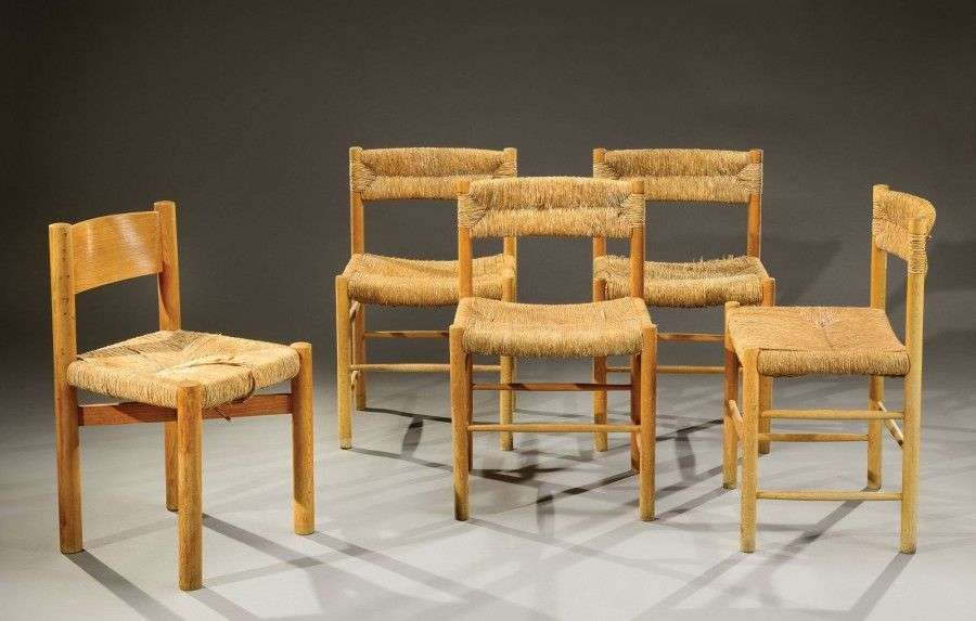 Suite de quatre chaises en chêne à dossiers incurvés et assise rectangulaire reposant sur quatre montants tubulaires reliés par des entretoises fuselées. On y joint une chaise en mélèze à dossier droit légérement renversé reposant sur quatre montants tubulaire rleiés par une entretoise en x. Assises et dossiers paillés. Vers 1950. H: 76 cm L: 47 cm P: 45 cm (taches,rayures d'usage, pailles accidentées et usées) A pair of ash stools on four slender uprights. Circa 1960. H: 17 ¾ in Diam: 13 in