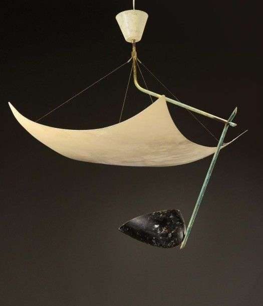Rare suspension en laiton tubulaire courbé anciennement patiné doré, enserrant un réflecteur ovoïde évasé en métal laqué noir se reflétant sur une plaque rectangulaire courbée en métal laqué blanc. Vers 1954. Etiquette d'origine "Made in Italy Arredoluce Monza" H: 90 cm L: 56 cm P: 56 cm (manque un élément tubulaire, oxydation, restauration et rayures) A rare tubular brass hanging lamp, originally gilded, holding a black lacquered metal reflector that reflects onto a white lacquered metal plate. Circa 1954. Original label "Made in Italy Arredoluce Monza" H: 35 ½ in L: 22 in D: 22 in Bibliographie: - Piero Castiglioni, "Lux Italia 1930-1990" Editer par Anty Pansera, Milan, 1991, modèle similaire reproduit à la page 59. - Anne Bony, "Les Années 50", Paris, 1982, page 257.