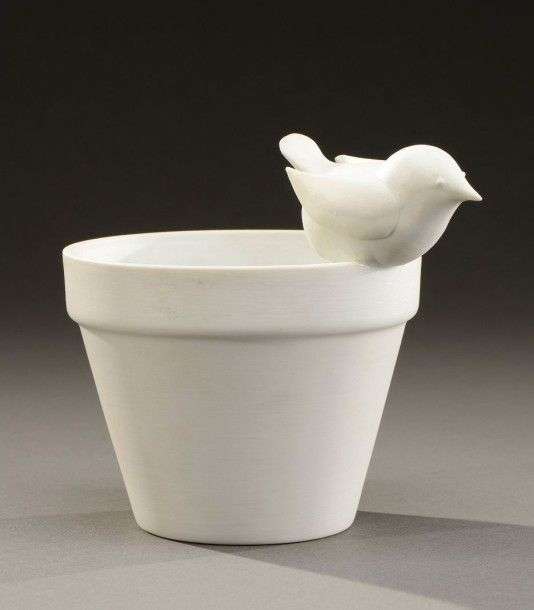 SANS TITRE (POT OISEAU)1998 Rare pot "oiseau" en biscuit de porcelaine de Paris. Signé et situé sous la base "Lalanne, Paris". Ce modèle a été édité à l'occasion de l'exposition "Les Lalanne" à Bagatelle en 1998. H: 12 cm "Oiseau", a rare pot in biscuit, Porcelaine de Paris. Signed and situated under the base "Lalanne, Paris". This model was edited for the exhibition "Les Lalanne" of the Bagatelle in 1998. H: 4 ¾ in
