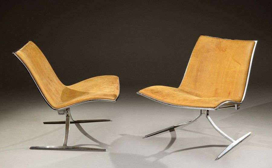 Paire de fauteuils "FK 710 skater" à assise formant dossier de forme galbée recouvert d'un cuir Camel reposant sur un piétement courbé à patins plats. Modèle créé 1968. H: 69 cm l: 66 cm P: 69 cm (légères usures, taches) "FK 710 skater", a pair of armchairs with a curved seat forming the backrest and covered with camel coloured leather. Model created 1968. H: 27 ¼ in W: 26 in D: 27 ¼ in Bibliographie: Jerryll Habegger and Joseph H. Osman, "Sourcebook of Modern Furniture", 1989, page 53.