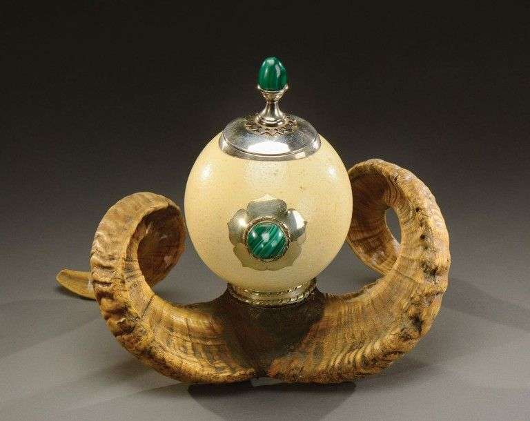 Pot couvert composé d'un oeuf d'autruche à monture et couvercle en métal argenté agrémenté d'oeufs en malachite et reposant sur deux cornes de béliers. Signé "Redmile London". Vers 1970-1980. H: 26,5 cm L: 33 cm P: 27 cm A covered pot composed of a mounting and lid in silver-plated metal embellished with malachite eggs on two ram horns. Signed "Redmile London". Circa 1970-1980. H: 10 ½ in L: 13 in D: 10 ¾ in