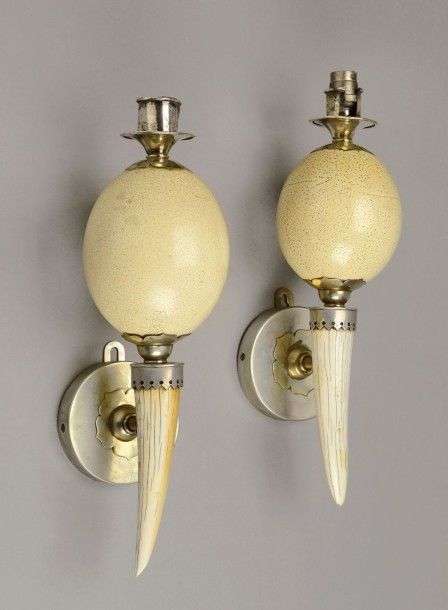 Rare paire d'appliques à platine de fixation circulaire enserrant un bras de lumière composé d'une corne en ivoire surmonté d'un oeuf d'autruche dans une structure en métal argenté. Vers 1970-1980. H: 39 cm P: 14 cm A pair of rare wall lamps holding a branch of lights composed of an ivory horn surmounted by an ostrich egg set in a silver-plated structure. Circa 1970-1980. H: 15 ¼ in D: 5 ½ in