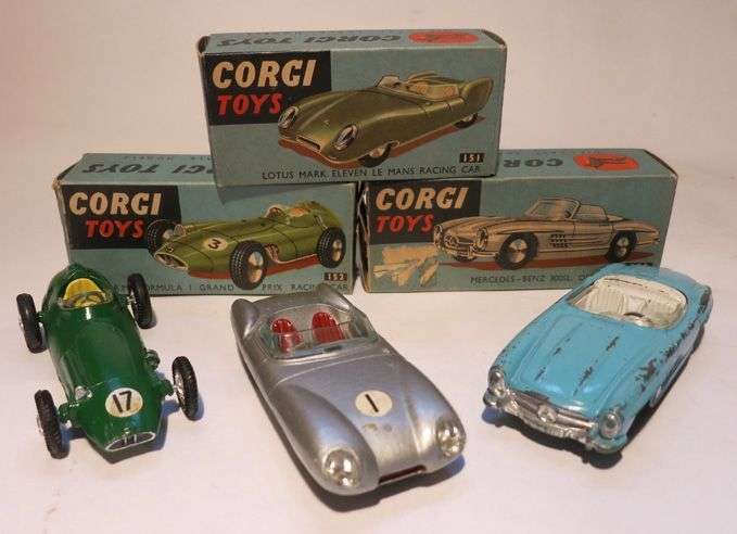Ensemble de 3 voitures dans leur boîte comprenant une BRM F1 Grand Prix ref 152, une Mercedes 300 SL ref 303, une Lotus Mark 11 ref 151, état d'usage