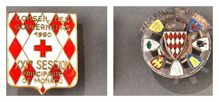 Lot de 2 épinglettes de boutonnière Conseil des Gouverneurs 1950 Principauté de Monaco et 24ème Rallye Automobile Monte Carlo 1954, bon état