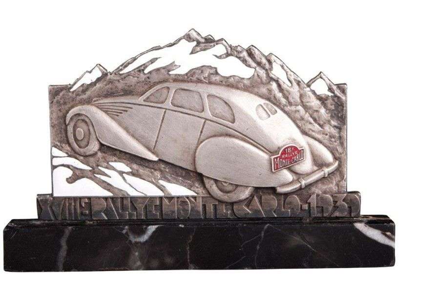 Badge 18ème Rallye Automobile Monte Carlo 1939 monté sur un socle en marbre, Très bon état