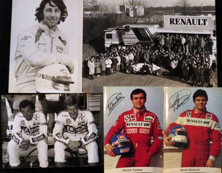Ensemble de 5 photos dont 2 autographes P. Tambay D. Warwick et Team Renau