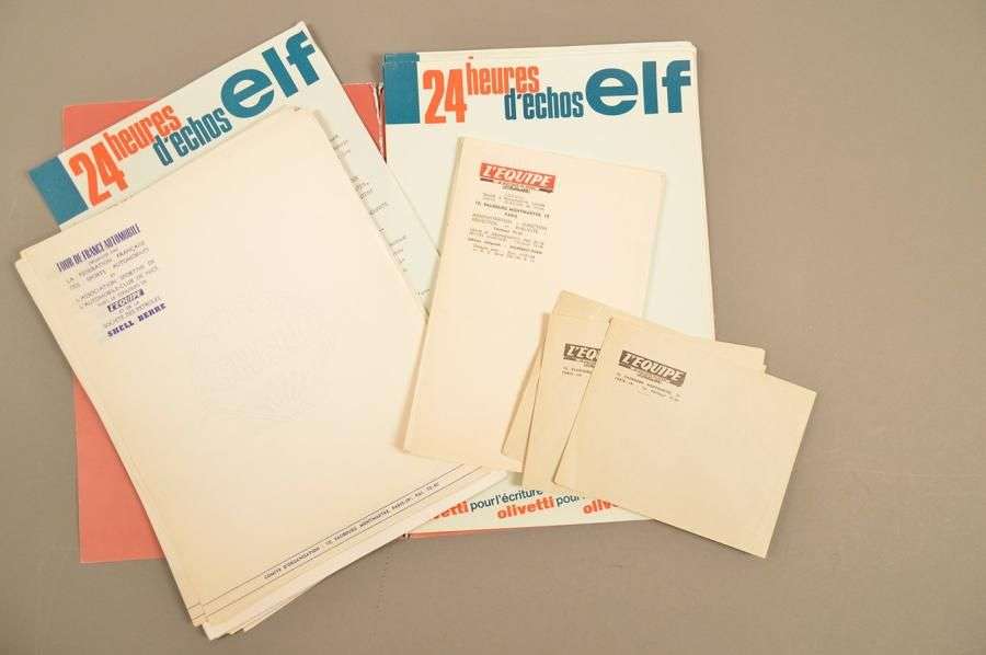 Ensemble de papier vierge à entête: - L'Equipe - Tour de France Automobile - 24 Heures d'Echos Elf On joint un ensemble d'enveloppes vierges l'Equipe
