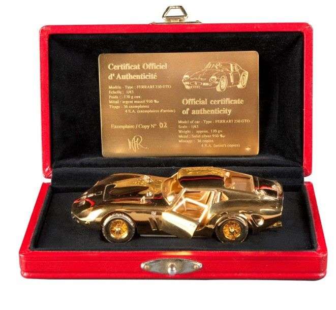 Miniature Ferrari 250 GTO Cette Ferrari 250 GTO à l'échelle 1/43eme est un vrai bijou. C'est un modèle d'orfèvrerie par sa réalisation, entièrement en argent recouvert d'or.? Tout est à la cote conformément aux plans d'usine. Elle est composée de plus de 250 pièces et entièrement démontable. Réalisée par Michel ROUVRAIS joaillier-bijoutier à la Monnaie de Paris, elle est numérotée, poinçonnée et titrée par la garantie de l'Etat. Celle-ci porte le numéro 2, seulement trois ont été assemblées. This little GTO is a real jewel ! A jeweller from "Monnaie de Paris" has built it in silver covered with gold. The miniature on 1/43 scale is an exact reproduction of the drawing from the Ferrari factory. It is made of 250 pieces and can bee dismantled. It is stamped headlined and numbered. Only three pieces.