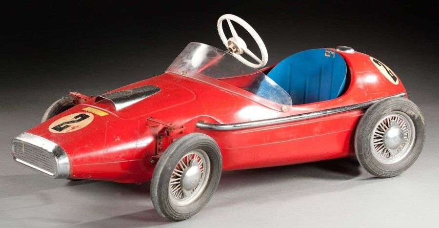 Voiture à pédalesTRI-ANG Jouet automobile des années 60 de la marque TRI-ANG fabriquée sans doute dans l'usine Guy à Givors. Modèle: Racer Cooper Grand Prix Châssis et carrosserie en tôle émaillée, pédales et siège réglables, pare-brise transparent, tuyau d'échappement chromé, grandes roues à rayons munies de pneus ballons. L: 120 cm (env.)
