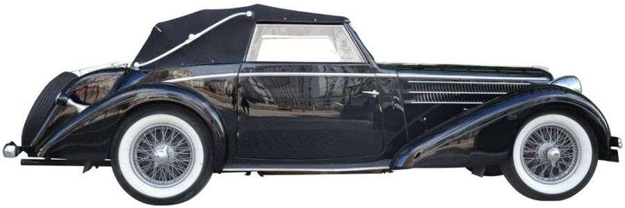 135 M CABRIOLET PAR CHAPRON «L'interprétation du cabriolet par Delahaye et Chapron» Fondée en 1894 par Emile Delahaye, la société commence son activité par la construction de moteurs ce qui lui permit, dès 1895, de produire le type 1, première voiture à recevoir l'allumage électrique. Lorsqu'Emile Delahaye disparaît en 1905, l'entreprise peut compter sur des hommes talentueux dont Charles Weiffenbach, qui la fait prospérer en construisant des voitures de grande qualité, fiables et rapides. En 1933, la firme s'oriente vers la production de grandes routières à caractère sportif. En 1935 Delahaye devient propriétaire de la marque Delage et en fin de cette même année, la société démarre la production du type 135. Issu du type 138, le type 135, apparu fin 1935 est proposé sur un nouveau châssis surbaissé avec un moteur 6 cylindres en ligne de 3,5 litres de 20 CV. Après l'essai d'une Delahaye 135 en 1938, le magazine spécialisé anglais "The Motor" écrivait: "Peu de voitures offrent une telle tenue de route, une telle maniabilité et de telles performances." Un tel jugement à l'égard d'une voiture française venant d'un journal britannique situe parfaitement le niveau des Delahaye à la fin des années 30. Le type 135 va connaître une carrière exceptionnellement longue. C'est une voiture à la fois solide, endurante, luxueuse et sportive qui donnera lieu à des versions de course et de rallye et à des cabriolets et coupés carrossés par les meilleurs stylistes de la période 1936-1952. Delahaye fournissait en effet des châssis nus. Le client avait donc le choix de sa robe et il y avait deux écoles de carrosserie: la traditionnelle avec Chapron, Letourneur & Marchand, Pourtout, Guilloré et l'autre qui recherchait un nouveau style avec Figoni & Falaschi, Saoutchik, Antem, Autobineau. C'est Chapron qui proposera le premier cabriolet 4 places. Au total, 2 592 Delahaye 135 ont été produites. Les survivantes sont devenues des pièces de collection particulièrement recherchées. Notre Del