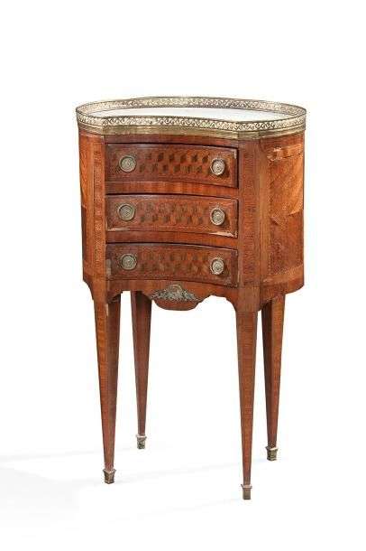 Table de salon de forme rognon en bois de placage marqueté de cubes. Elle ouvre à trois tiroirs en façade. Pieds gaines. Plateau de marbre blanc ceint d'une galerie de laiton reperçé. Epoque Louis XVI H: 79 - L: 47.5 - P:34 cm (sauts de placage et soulévements)