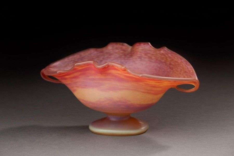 Grand vide-poche formant coquille en verre dans les tons nuancés roses et jaunes posant sur piédouche. Signé "DAUM NANCY" Vers 1900 Dim.: 14,3 x 28 cm