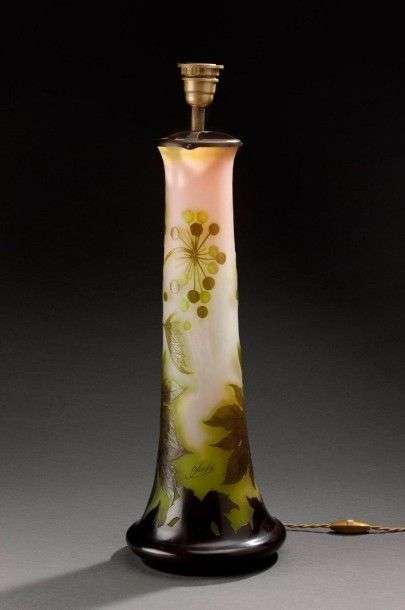 Emile GALLÉ Très important pied de lampe en pâte de verre de forme conique aux cols et pieds légèrement évasés, à décor dégagé à l'acide de feuillage d'érable et de fleurs dans les tons nuancés vert et roses. Signé "GALLE". Vers 1900 H. sans la monture: 53,5 cm