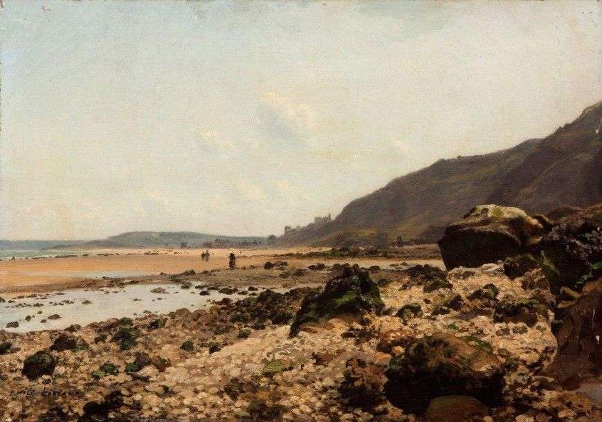 Villers sur mer: La plage des vaches des noires au niveau du Saut du chien, circa 1865 Huile sur toile, signée en bas à droite 38 x 54 cm Elève du mariniste Jules Noël, Laborne fut un peintre raffiné de vues urbaines et de paysages. Paris, la vallée de la Loire, le sud de l'Espagne furent souvent traités par ses pinceaux. Notre tableau date probablement du début/milieu des années 1860, période où Laborne exécute plusieurs vues des côtes normandes: Le Tréport, Fécamp, Honfleur, et Villers sur Mer notamment. On distingue les premières villas villersoises construites à cette époque sur la corniche par l'architecte parisien Félix Pigeory, et au fond le mont Canisy. Laborne réalise ici un paysage côtier où la forte présence de l'élément minéral rappelle stylistiquement les oeuvres d'Octave Penguilly L'haridon (1811-1870), et plus particulièrement un tableau attribué à Penguilly reprenant ce même thème des Vaches Noires avec un cadrage assez proche, et récemment passé en vente publique