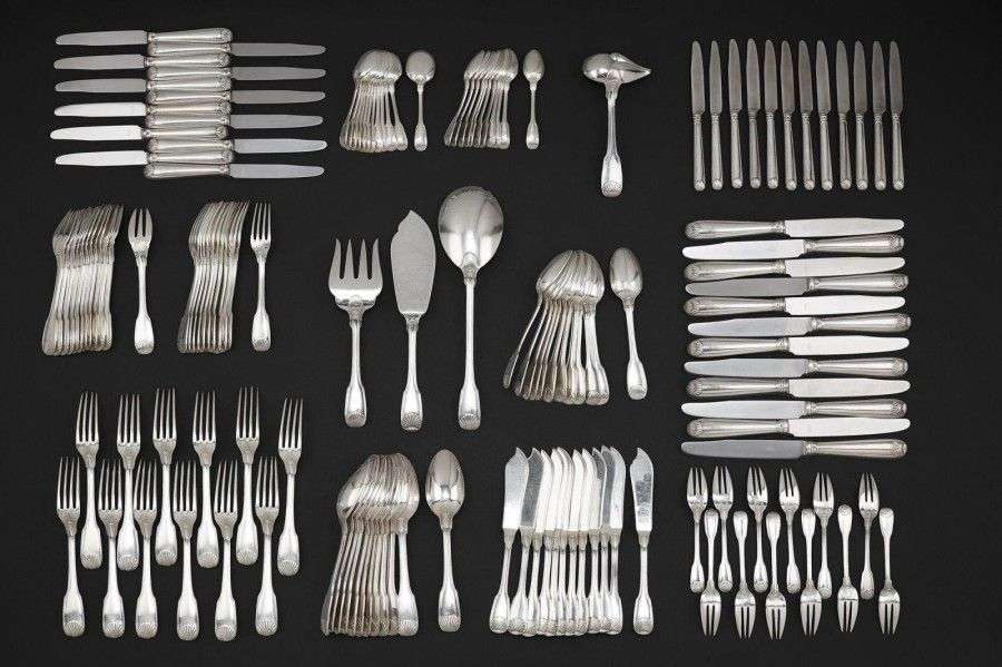 Importante ménagère en argent, modèle à filet et coquilles de style Louis XV. Elle comprend: - Douze fourchette de table| - Douze couteaux de table| - Douze cuillères de table| - Douze fourchettes à poisson| - Douze couteaux à poisson| - Douze fourchettes à huîtres| - Douze fourchettes à entremets| - Douze cuillères à entremets| - Douze couteaux à dessert| - Douze couteaux à fromage| - Douze cuillères à glace| - Onze cuillères à café| - Une fourchette de service à poisson| - Une pelle de service| - Une cuillère à sauce| - Une pelle à tarte. Poinçon minerve. Orfèvre: HENIN & Cie. Poids brut total (avec les couteaux): 8395 g