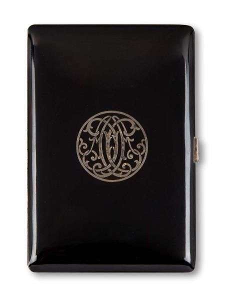 Boîte à cigarette en vermeil laqué noir et orné d'un monogramme. Travail f