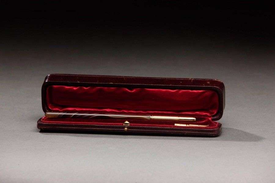 Porte-mine en agate et or jaune 18K. Dans son écrin d'origine daté 1899 et monogrammé. Orfèvre: BLANZY POURE & Cie Poinçon tête d'aigle L: 18,8 cm Poids brut: 14 g