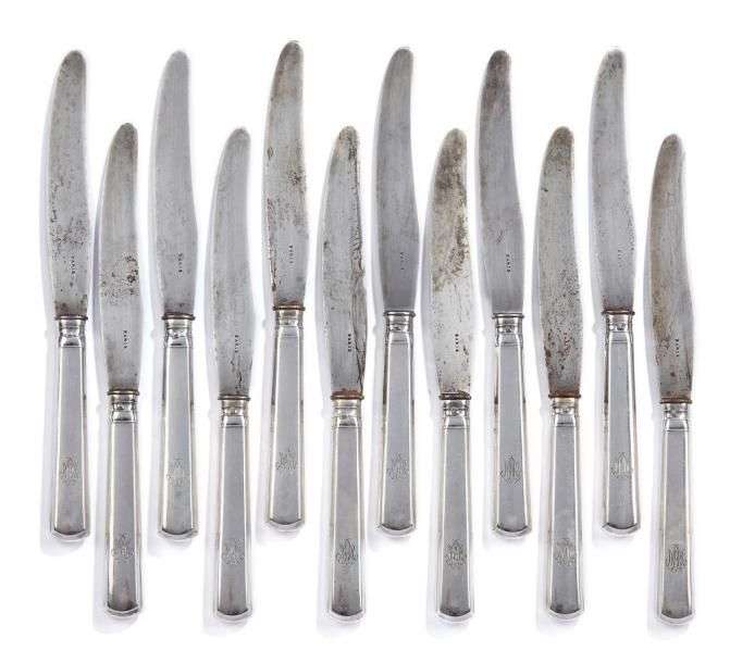 Suite de douze couteaux en argent et lames en acier. Monogramme. Ecrin. Po