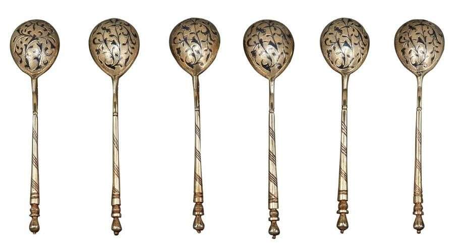 Suite de six cuillères russe en vermeil, tiges torsadées et cuillérons à motifs feuillagés et niellés sur fond amatti. Travail russe, 1850. Poids total: 184.48 g