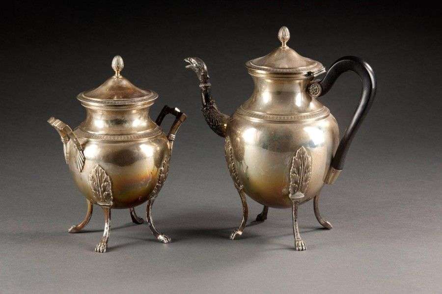 Ensemble en argent de style Empire comprenant une théière et un sucrier à quatre pieds griffes coiffés d'attaches feuillagées, à liseré de feuilles d'eau repris au couvercle et bec verseur à tête d'aigle. Une anse en bois noirci et deux autres en argent à double attache coquille. Prises des couvercle en forme de bourgeon stylisé. Poinçon minerve et poinçon d'orfèvre H: 22 et 25 cm Poids brut total: 1594 g