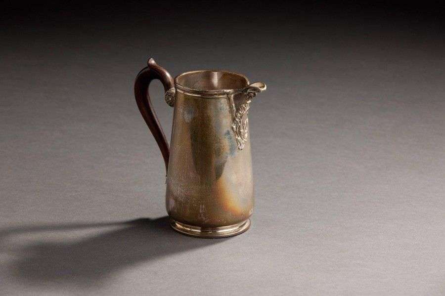 Pot à lait en argent de forme conique posant sur pied bate, à bec verseur feuillagé et anse en bois à double attache. Poinçon minerve Orfèvre: Alfred HECTOR H: 13,4 cm Poids: 282 g. Infimes chocs