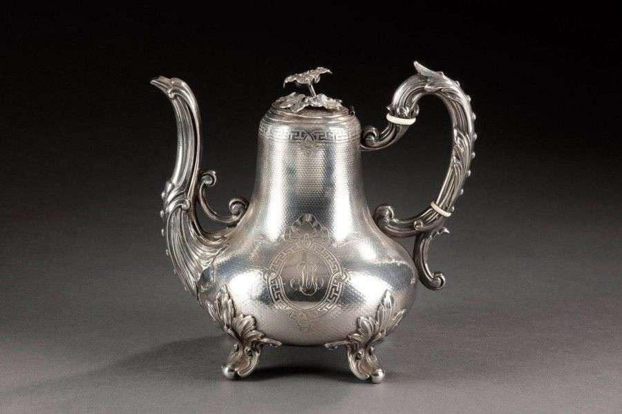 Belle théière en argent guilloché posant sur quatre pieds feuillagés, à corps pansu et monogrammé. Bec verseur et anses traités en enroulements et feuillages. Col droit coiffé d'un liseré orné d'une frises de grecques. Prise du couvercle en forme de fleur éclose sur un tertre feuillagé. Poinçon minerve Orfèvre: Charles HARLEUX H: 20,5 cm Poids: 626 g