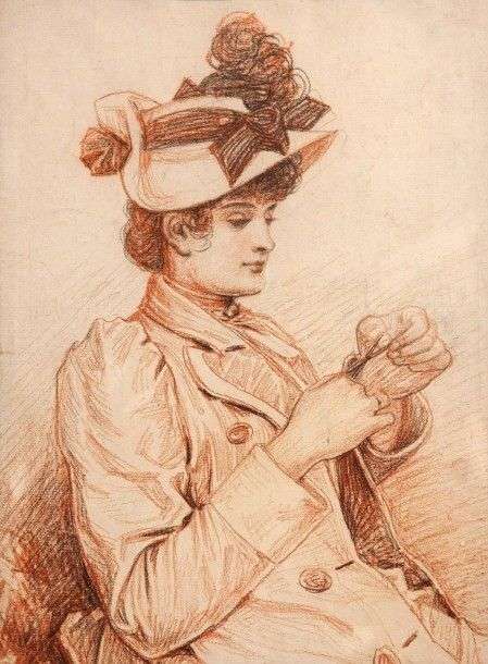 Portrait de jeune élégante au chapeau Fusain et sanguine sur papier 39 x 29 cm à vue