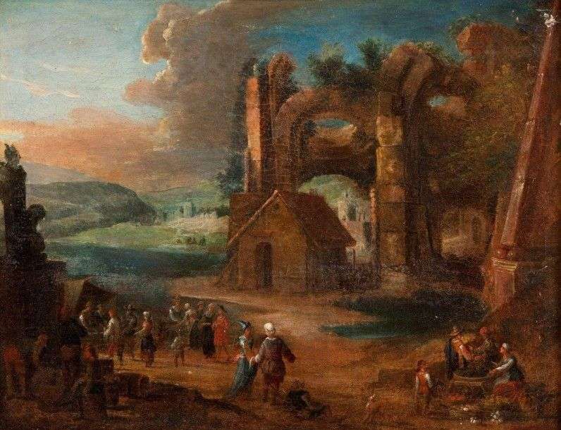 Personnages dans un paysage avec des ruines antiques Huile sur toile 34 x 44 cm