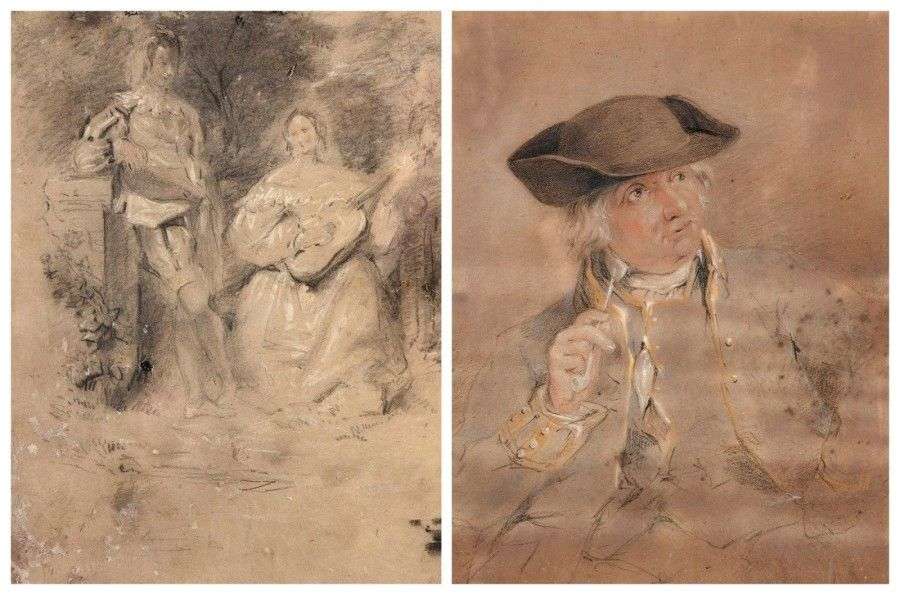 Portrait d'homme fumant la pipe Concert galant Dessin double face sur papier, fusain rehaussé de pastel et de craie blanche et fusain rehaussé de craie blanche 30 x 23 cm environ