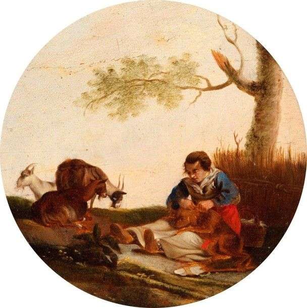 Jeune bergère épouillant son chien Huile sur bois Diam: 25.5 cm Craquelures et soulèvements